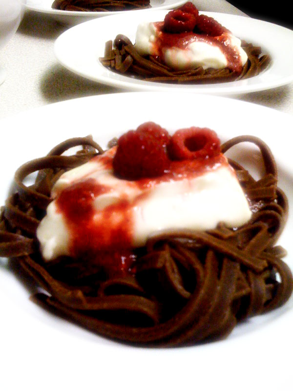 Now, the actual taste was not bad. It was a texture thing mostly. My dearest friends Tracey and Michele (aka my skillful sous chefs, faithful Guinea Pigs & favorite porch pals) eagerly tasted the concoction with me. We were all in agreement… the soft, slippery texture of the linguini – which we normally love with a good marinara sauce – felt strange in our mouths when combined with the sweet chocolate, raspberry & cheesecake mousse. And honestly, as you can see by the photos… the dish was not very appealing to look at… kind of resembled a pile of… well… dog poo. Or a dish of brown leather shoe laces with dessert plopped on top of them. It wasn’t pretty.