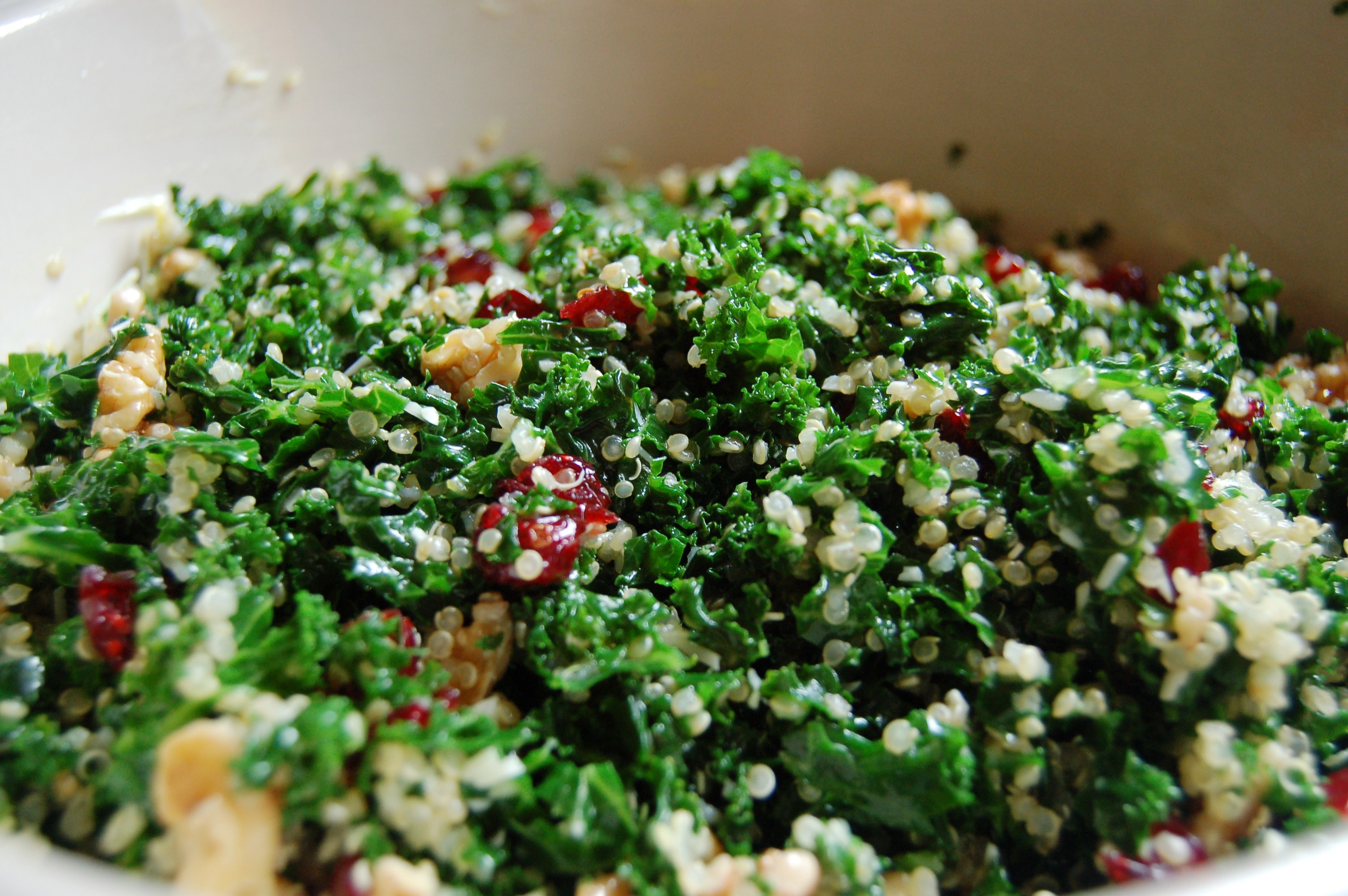 This salad is loosely based off of my kale and walnut pesto recipe. But with a few revisions, I’ve come up with a salad that’s light, yet hearty enough for a main course! And as always, there’s room for plenty of versions – substitute your favorite nuts and dried fruits to make it your own. You can swap out the quinoa for bulger wheat or another of your favorite grains or seeds. Just remember, the key is in the blanching of the kale which brightens up the leaf and softens its texture.