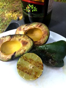 Place avocados and lime halves flesh side down on grill. Place onion and pepper on grill. Leave avocado and lime alone – it’s tempting to pick up and check but you risk squishing them and losing avocado in the fire. They will take roughly 5 minutes on medium heat. The limes will start to brown at the edge when they’re ready.