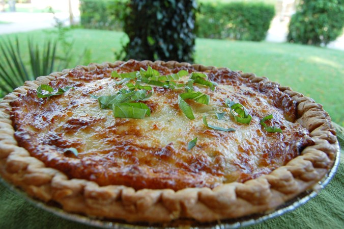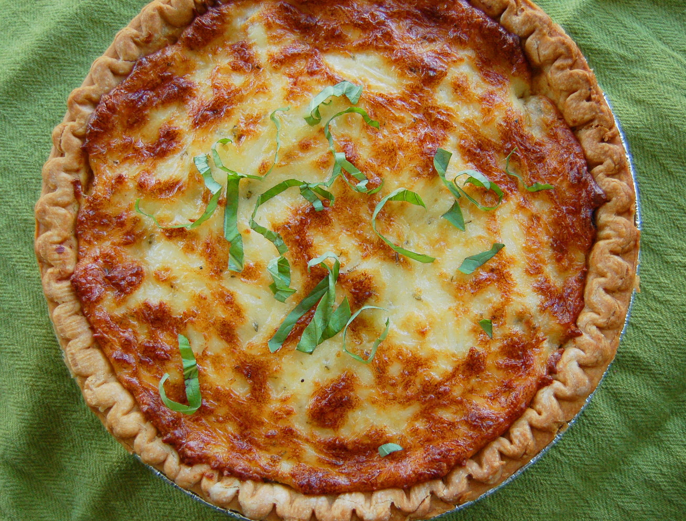 While the pie crust is still warm, brush on your favorite Dijon mustard. Then sprinkle the bottom of the pie crust with the chopped onion. Spread the chopped tomatoes over the onions. Scatter the sliced basil over the tomatoes. Spread the cheese mixture evenly over the tomatoes, covering to the edge of the crust.