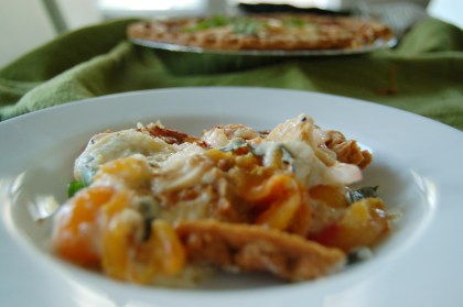 Place in oven and bake until browned and bubbly, anywhere from 25 to 35 minutes. Let cool for 35-45 minutes before slicing and serving. you can reheat it if you want but trust me on this, if you cut it too soon the “pie” shape will not hold. Don’t believe me? Check out my first slice below (5 minutes out of the oven). More like tomato stew than pie.