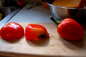 Cut squash in half lengthwise and scoop out seeds, then quarter if squash is large. Coat in olive oil and place flesh side down on cookie sheet. Roast on top rack of oven at 425ountil tender… roughly 45-50 minutes. Be sure to use a cookie tray with at least a 1/2 inch lip as squash will give off a lot of water.