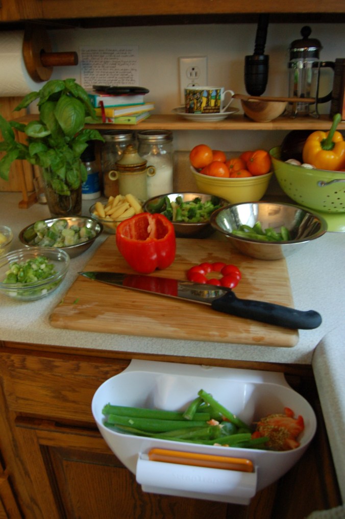 Also, for additional food prep ease, check out this handy-dandy little item below. I picked it up in a quaint kitchen store in Myrtle Beach recently. It. Changed. My. Life. Okay that’s a slight exaggeration… I’m not really a full-on gadget-geek but this is a wondrous invention! It’s a little scrap-catcher… no more dragging the big kitchen trash can over or making a mess of your counter tops… just swipe the scraps off the cutting board! (Info-mercial royalties would be nice here).